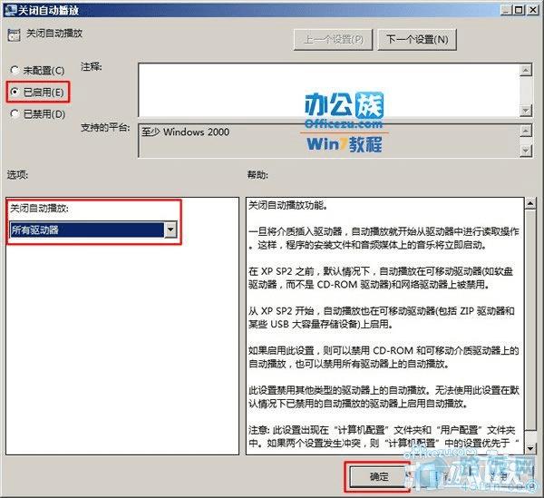 22、 选为“已启用”再将“关闭自动播放”设置为“所有驱动器”接着按“确定”。
