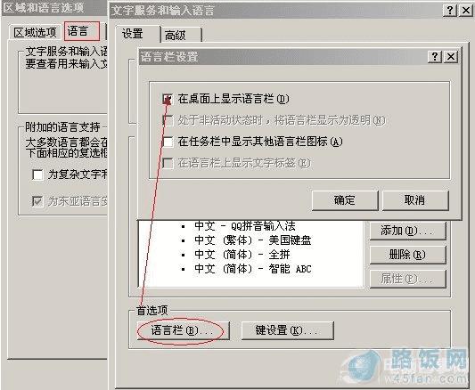 方法二:单机开始——控制面板——区域和语言选项,看到语言的菜单,有个详细信息,有个语言栏选项打开选择在桌面显示语言栏打开如图,