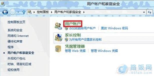 2.找到并打开用户账户和家庭安全,选择用户账户。