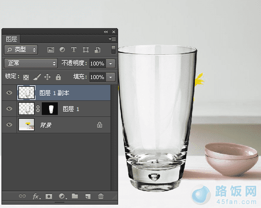 第五步:然后将杯子拖拽到准备好的背景图层里,CTRL+J复制一个将蒙版删掉,如下图所示