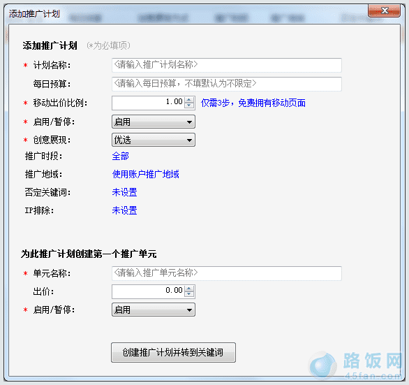 在创建推广计划时默认必须创建这个计划下的一个推广单元,您需要添加该单元的基本信息(名称,单元默认出价,启用/暂停状态)