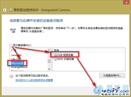 4、取消“显示兼容硬件”的勾选项,在“厂商”中选择“Microsoft”,在“型号”中选择“USB视频设备”,点击下一步