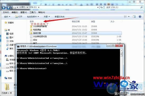3、文件创建完成了,如果要删除该文件夹的话,在cmd模式下输入rd命令“rd e:wenjian..”回车即可。
