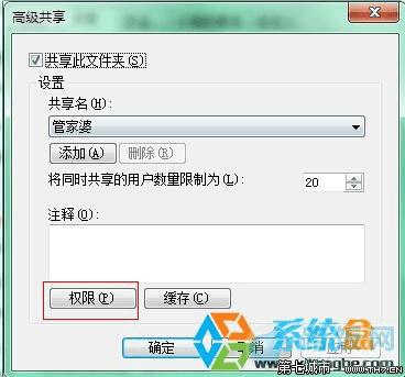 4、在弹出的高级共享设置页点击“权限”按钮;