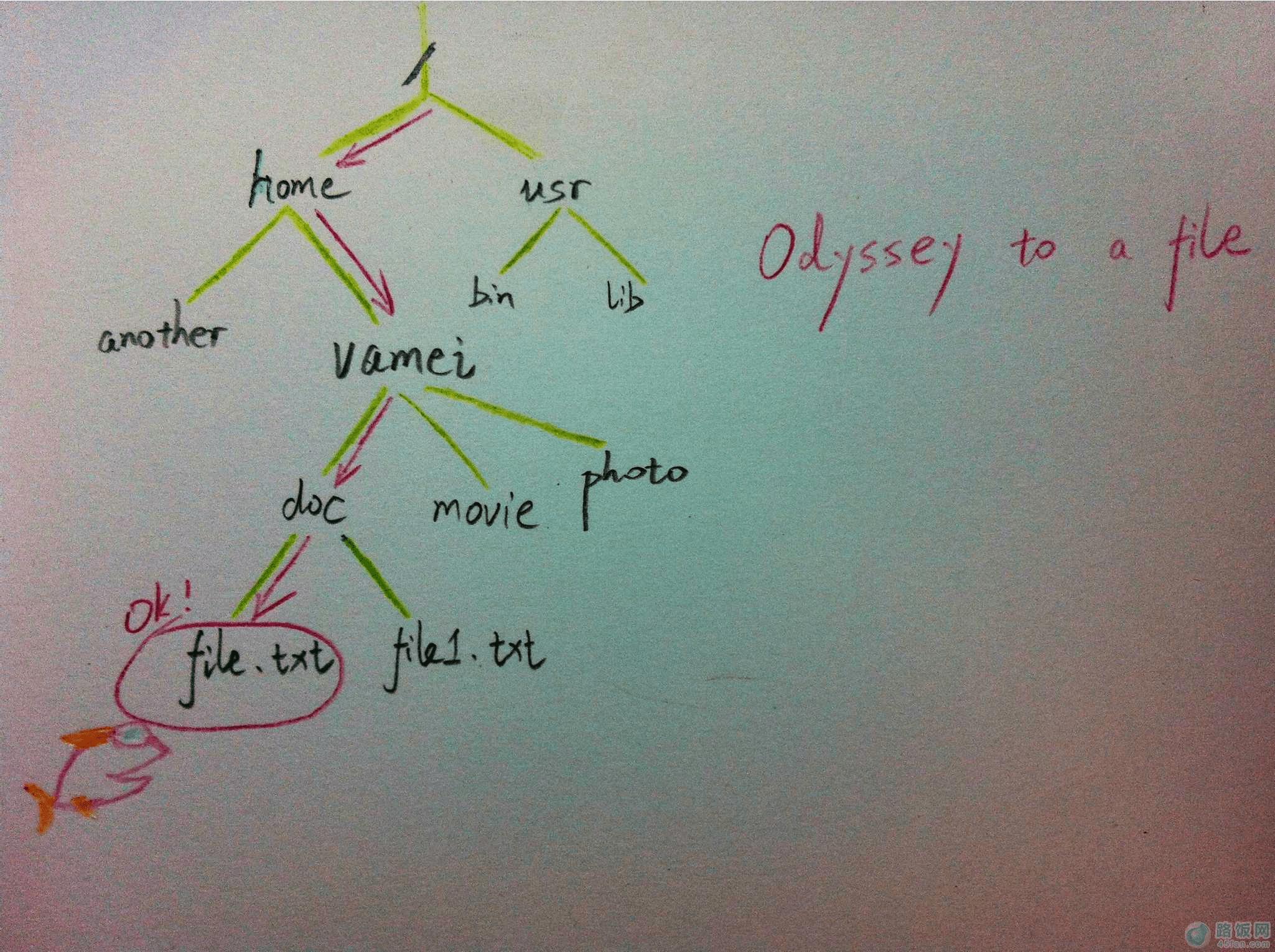 Linux解释一个绝对路径的方式如下:先找到根目录文件,从该目录文件中读取home目录文件的位置,然后从home文件中读取vamei的位置……直到找到目录doc中的file.txt的位置。