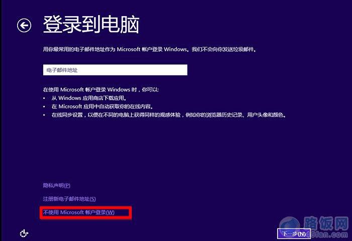 7、在登录到电脑这,选择左下角的不使用Microsoft账户登录,然后点击下一步