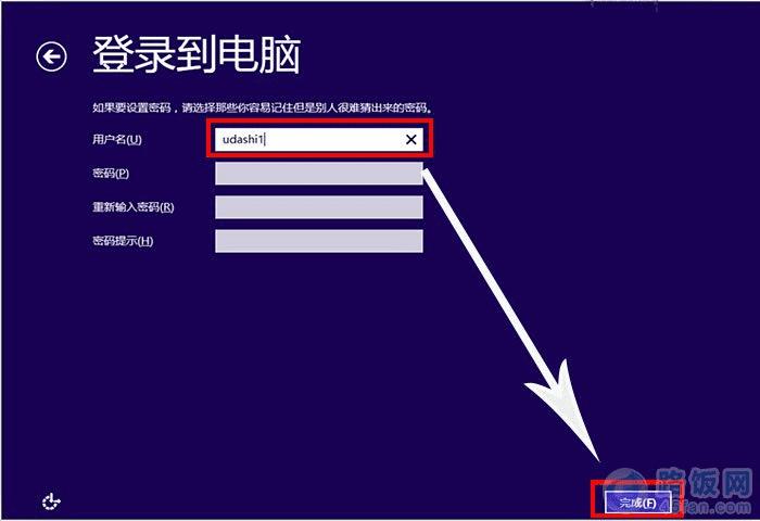 9、在用户名这里输入想要输入的用户名,然后点击完成