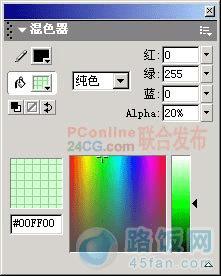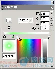 2.按快捷键Shift+F9打开“混色器”面板,如图2所示进行设置。其中,3个滑块的颜色分别是(从左至右)#FFFFFF、#54FF4B、#FFFFFF。Alpha值分别为80%、70%和0%。当鼠标变成图2所示的样子时,单击左键就可以添加一个滑块。按住滑块拖出面板,再松开鼠标左键,即可删除滑块。