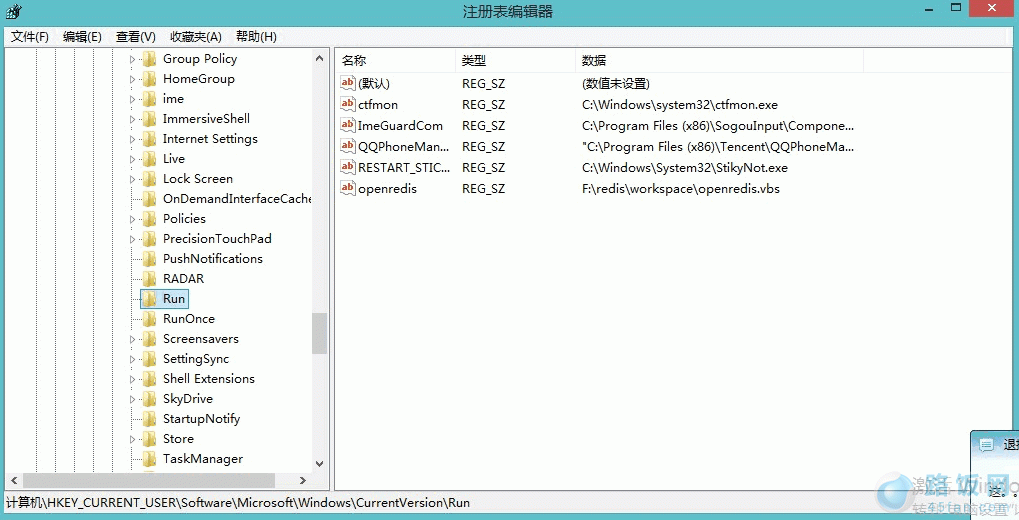 【HKEY_CURRENT_USER \Software \Microsoft \Windows \CurrentVersion \Run】新建字符串值openredis,如下图添加vbs路径,即可实现开机自动启动Redis。