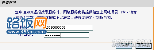 3、在上网帐户及上网口令栏中输入由ISP运营商提供的宽带帐号和密码,单击下一步。