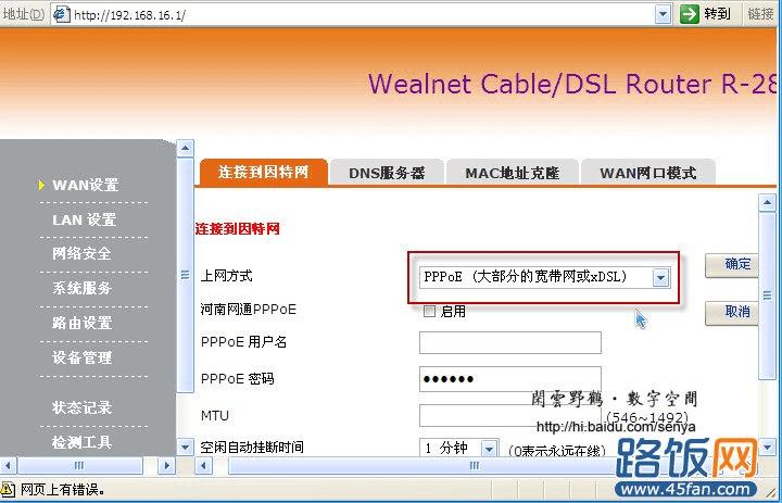 5、开始配置上网方式及其它参数,如采用PPPOE拨号模式,则需要输入运营商提供的帐号和密码。单击”WAN“设置,选择上网方式: