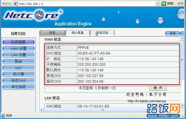 6、配置完PPPOE拨号模式完成后,路由器将自动获取IP地址、子网掩码、网关及DNS地址。无需另外配置!