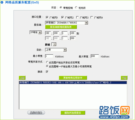 某些BT下载包非.torrent格式,而是压缩包格式,此时采用第一种方法无法启到相应限制作用。那我们该如何解决此问题呢?侠诺qno路由器具备QOS功能,QOS功能就是指路由器限速功能,可以对相应IP地址及IP地址段设定最大上传或下载速率,从而有效控制局域网下载速度。 进入Qos带宽管理-》带宽管理页面,再在网络质量服务配置(QoS)配置相关参数 ,如下图所示: