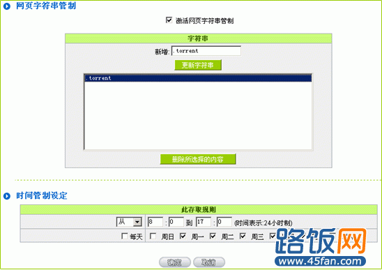 说的明白点就是限制后缀名称的方式限制BT下载。我们都知道,BT种子的后缀名称一般为.torrent,我们可以在路由器内置的防火墙中拒绝.torrent种子文件即可。此处选项还可以规定某个时间段是否允许.torrnet下载,如上班时间不允许BT下载,即将周一至周五勾选,时间段设置为8:00-17:00即可。同理,如允许周六、周日下载,则开放相应时间段即可。非常人性化的管制,对于局域网的管理效率非常有效!设置方法:登陆路由器界面,然后进入防火墙配置-》网页内容管制-》启动网页字串管制(将前面做“√”选)如图。