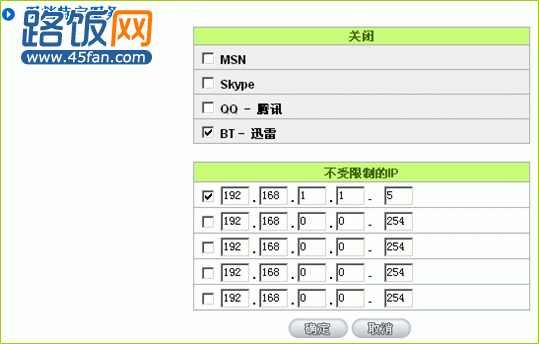 稍高端一些的企业级侠诺qno路由器具备一键设定某些服务允许或不允许,如MSN、QQ、SKYPE、迅雷等。如果不具备此功能,可以去侠诺官方网站查看路由器固件升级包,详见:http://www.qno.cn/web/downloads.asp。相关阅读:路由器固件升级通过教程。同时还可以设置某些IP或IP地址段不在受限制范围内。如下图所示: