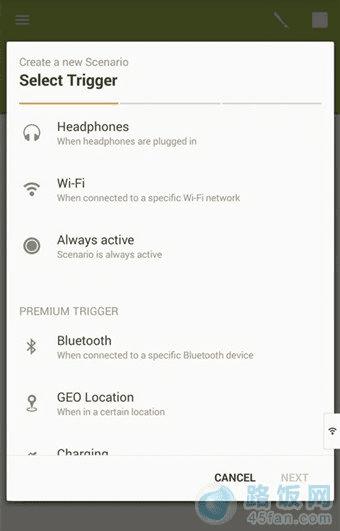 想要实现带有场景识别的侧边栏非常简单,点击 + 按钮我们可以看到Sloth Launcher提供的八种触发类型,包括耳机、WiFi、蓝牙 … 其实使用频率最高的可能也就是WiFi了。以 WiFi为例,当你选择公司的WiFi信号,就可以在Sloth Launcher设置你在公司期间经常打开的应用程序,并显示在侧边栏。
