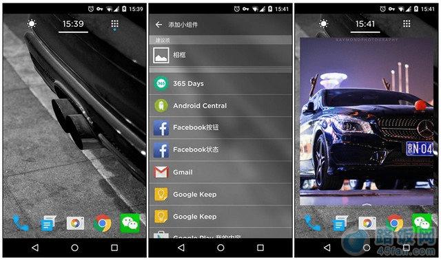 进入主界面后,可以看到Aviate的主页十分简洁,屏幕下方显示的是使用次数最为频繁的5个应用,上方有当前时间、情景模式以及应用菜单栏的图标。长按桌面还可以像桌面添加小部件,譬如下图中的相框,可以展示照片。