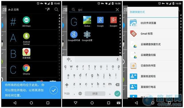 继续向右滑动就进入了所有应用列表,它以应用的拼音首字母排列,应用名称开头为数字的都显示在"#"类别中。右上角还有创建快捷方式图标和搜索功能,可以向应用列表中添加快捷方式。