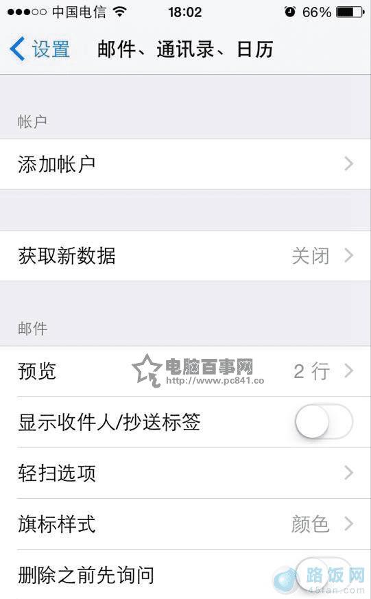 1.从iPhone6桌面进入【设置】,然后再进入【邮件、通讯录、日历】设置,如下图所示