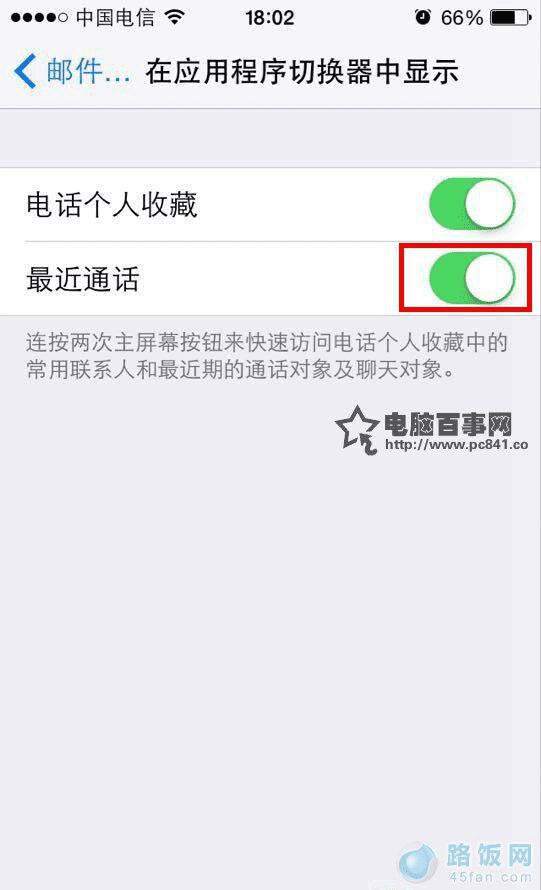 3.将两个选项【电话个人收藏】【最近通话】关闭即可,然后双击HOME键,打开后台,就可以看到联系人头像已经消失了。