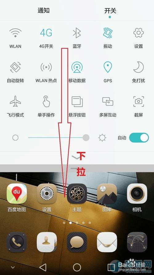 2、从屏幕顶部往下拉出“通知”和“开关”栏。