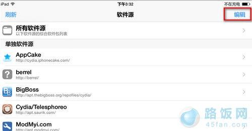 如何添加呢?打开 Cydia ,点底下“软件源”,再点编辑,然后左上角就会在软件源列列表,如下图所示,点右上角的编辑,然后左侧的刷新就会变成添加,然后再点添加,就会出现一个地址栏,键入:"http://apt.so/aptso" 搜索,然后Cydia会自动添加“刀八木”源。