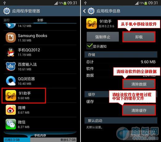 5.选中您想要优化的应用程序(这里以“91助手”为例)。进入后,您可以直接选择“卸载”、“清除数据”、或“清除缓存”,来进行优化,从而来释放您的机身内存(部分应用不可删除)。