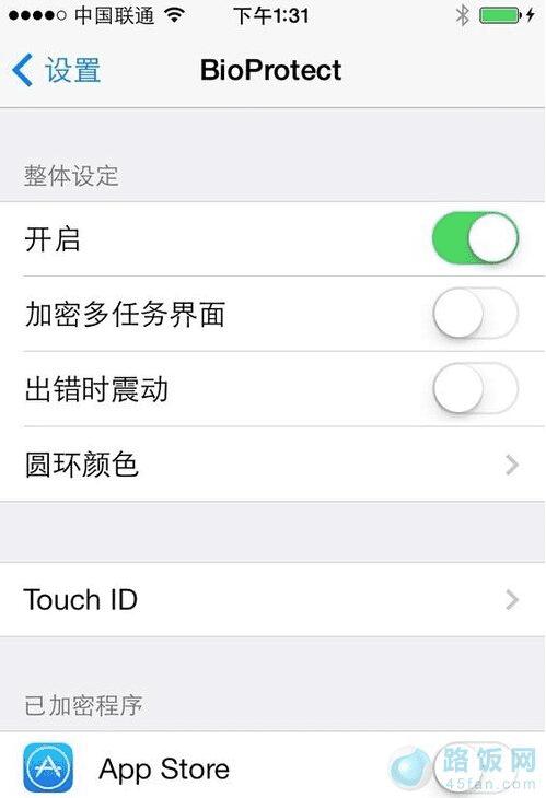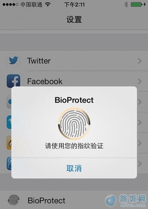 1.首先下载或者添加相关源(大家先在网上找最新并能兼容自已手机设备的源,比如威锋源http://apt.feng.com/等),再添加bioprotect插件。关机重启二次手机以后,在设置列表中找到“BioProtect”插件选项,如图所示