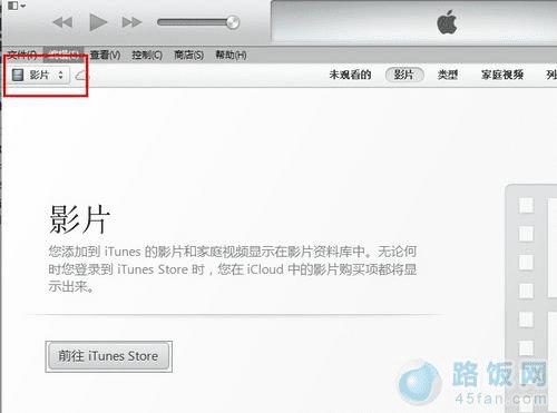 2.当iTunes成功识别出iPhone后,请点击iTunes界面左上角栏目中的“影片”,那么此时界面右侧则会显示iTunes音乐资料库里的所有已导入的电影。这里的导入意思是将你本机上的电影文件导入进iTunes的电影资料库里。