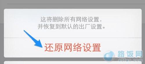 6、最后再点击底部的“还原网络设置”就可以了。还原以后再尝试重新连接网络,一般情况都可以解决,如果都不能解决的话,还有一种情况是手机的WIFI损坏了,建议拿手机维修店检修。