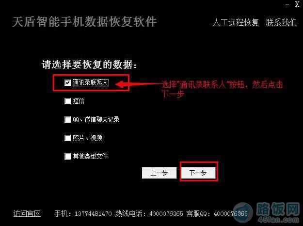 第四步:选择需要恢复的数据,这里大家需要选择“通讯录联系人”按钮,然后进行下一步。
