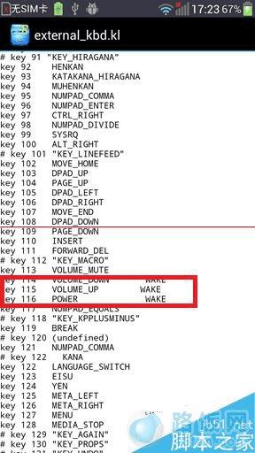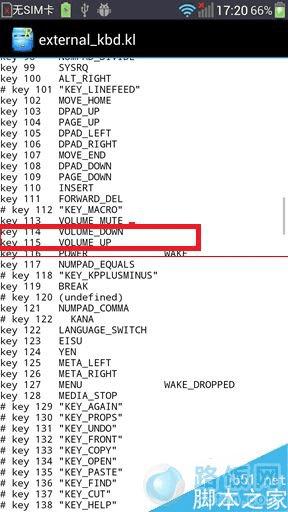 5、选择“文本编辑器”打开文件,如下图2示,找到VOLUME_DOWN和VOLUME_UP两项。不同手机按键ID不一样,请找到VOLUME项。