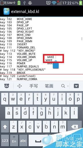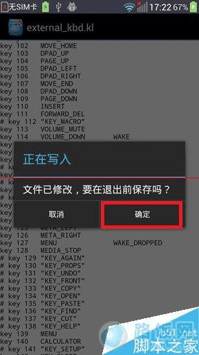 6、空格(至少一格),输入"WAKE",如果只要下键点亮屏,就在下键处加,输入完成后,点击返回,会提示是否保存,点击确定。