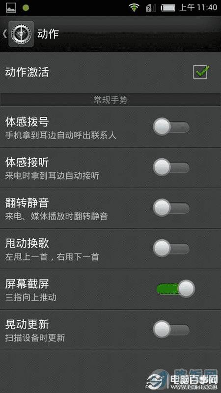 3:勾选动作激活→将屏幕截屏三指向上推动打开→如下图所示
