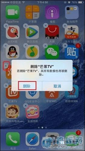 2、此时只需要点击需要卸载软件图标上的x按钮即可,比如小编要卸载“芒果TV软件”只要点击这个软件图标左上角的X,在弹出的确认对话框中,点击【删除】就可以快速卸载该软件,如下图所示。