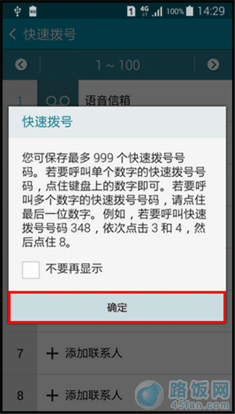 5.阅读出现的快速拨号提示后,点击【确定】即可。