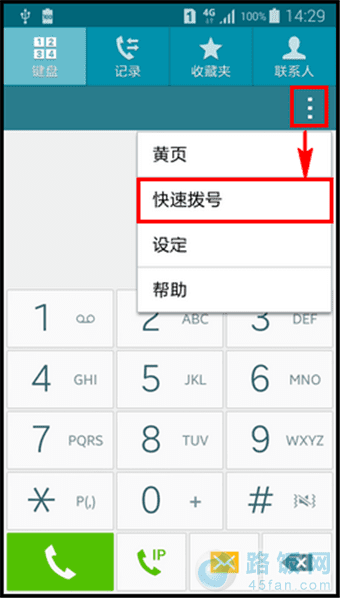 2.点击屏幕右上方的【菜单】键,选择【快速拨号】。