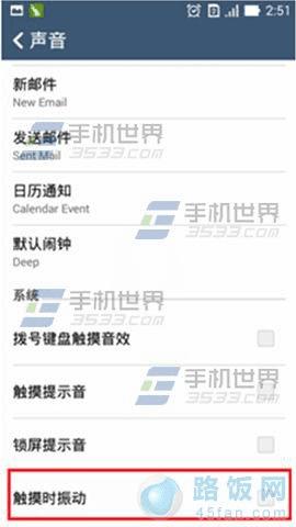 打开华硕ZenFone2【设置】,找到并点击【声音】,将【触摸时振动】取消勾选即可。(如下图)