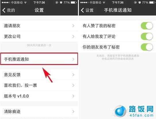 二,在【设置】界面就能看到【手机推送通知】设置了。大家进入后可以对赞自己的,评论,朋友发布的秘密进行选择是否接受推送。