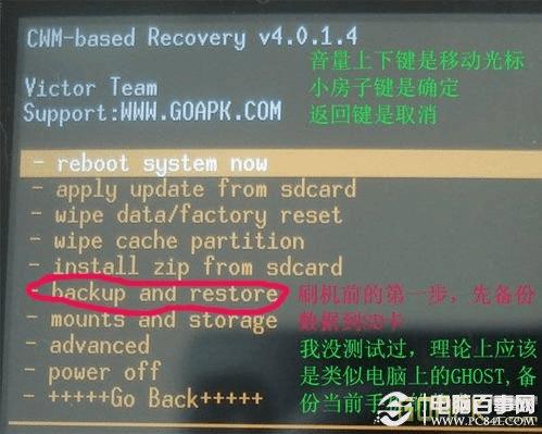 你要做的第一步就是用音量上下键移到backup and restore,把当前手机的状态备份到SD卡上,如果你不需要备份的话
