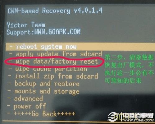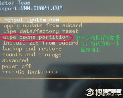 等个几秒钟,程序会跳回这个界面,你把光标移到下图的那个wipe cache上头,操作同上,这一步就是清除缓存数据.