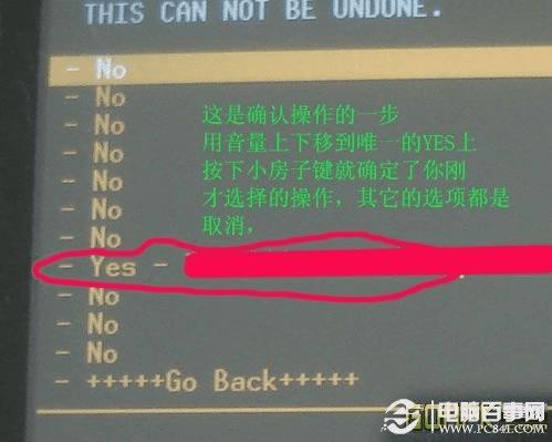 第二步就是把光标移动到 wipe date/factory上头,然后按下小房子键确定,进去后是另一个很多no no no 的界面,把光标移到唯一不是NO的那个上头,按小房子键确认,这一步就是就是清除你手机里的你安装的程序和所有数据,而且没有办法恢复,确保在做这一步之前把你手机里的数据备份了哦,没有后悔药吃啊