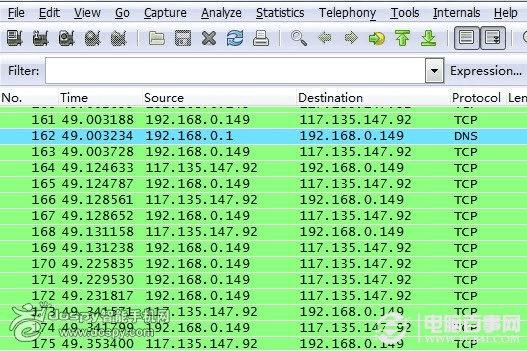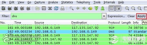 你一定会抱怨:这么多数据,又是这样地一团乱麻,这怎么看嘛!别急,白鸽教你开个小外挂在Filter的文本框里输入dns,然后点击右侧的Apply按钮: