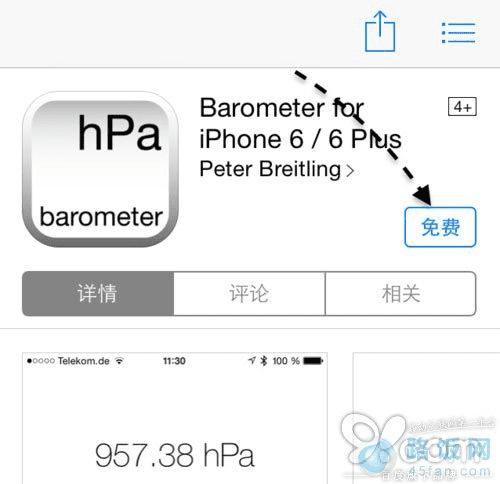 如果当前已经有了苹果 iPhone6 的小伙伴,想要检验一下“气压计”的效果,可以前往 App Store 下载 Barometer for iPhone 6 / 6 Plus 这个应用软件。当然你也可以直接在手机上打开这个网址