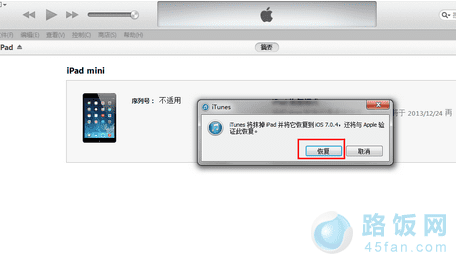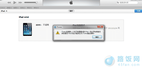 2、iTunes会自动检测到一台等待恢复的设备,点击确定;