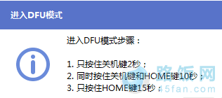 1、打开iTunes,断开iOS设备与电脑的连接。长按【home键】+【电源键】8秒强制关机 -- 关机后长按【home】键8秒--通过USB数据线连接电脑,或者请把设备链接电脑,先按住电源键2~3秒,然后继续同时按住电源键和Home键,持续到第10秒的时候,请立即松开电源键,并继续保持按住Home键,直到在电脑上看到识别到DFU状态下的USB设备时就进入到DFU模式了,这个时候iTunes会自动或者手动启动。