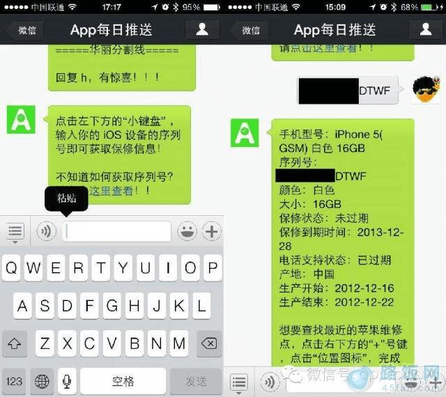 然后在微信上关注App每日推送 的公众号(微信搜“apptoday”或者是“App每日推送”关注 ),把刚复制的序列号粘贴到输入框发送便OK,手机型号、保修信息一目了然!