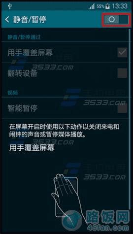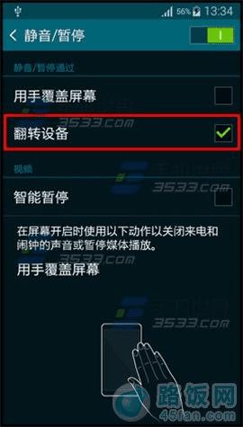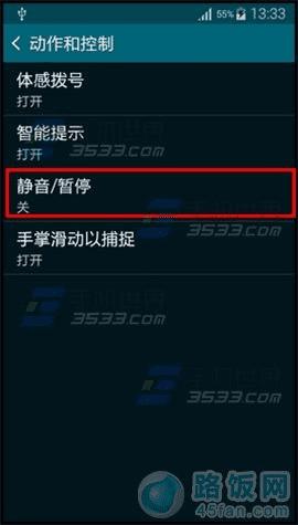 1)进入三星Galaxy S5的【设定】,选择【动作】栏的【动作和控制】,然后点击【静音/暂停】。(如下图)