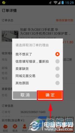 2)点击订单管理界面的左下角的“取消”,会弹出确认窗口,选择理由后点击“确定”即可,订单取消成功。(如下图所示)