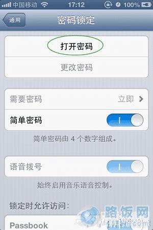 设置方法:依次点击iPhone上面的【设置】、【通用】、【密码锁定】,点击顶部的【打开密码】,接着就可以输入一个四位数的密码了。当然了,如果你的资料很重要, 四位数的密码不足以满足的你的需求,你还可以设置成强密码的,方法是,先把下方的【简单密码】关闭,接着就可以输入包含大小写字母或数字的强密码了。